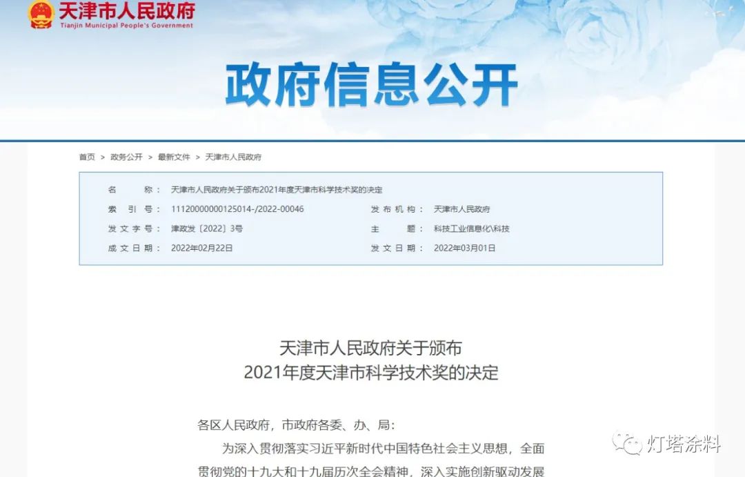 榮譽 | 燈塔涂料再獲2021年度天津市科學技術進步獎