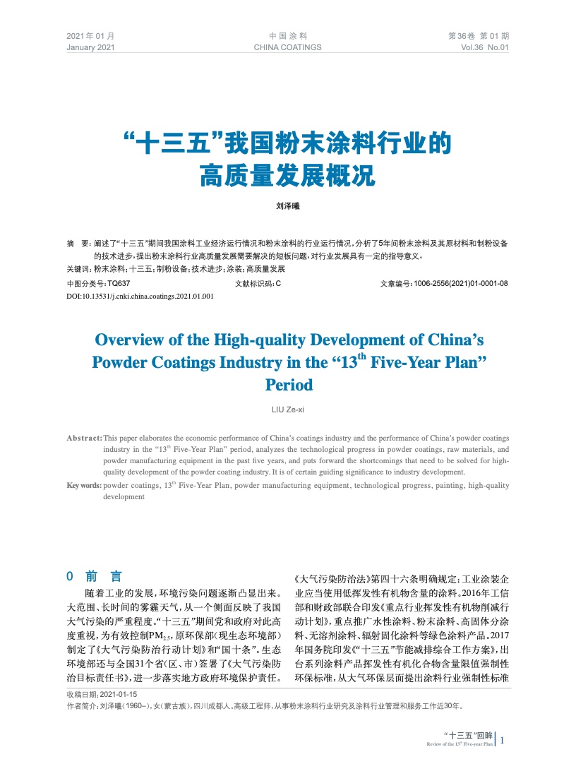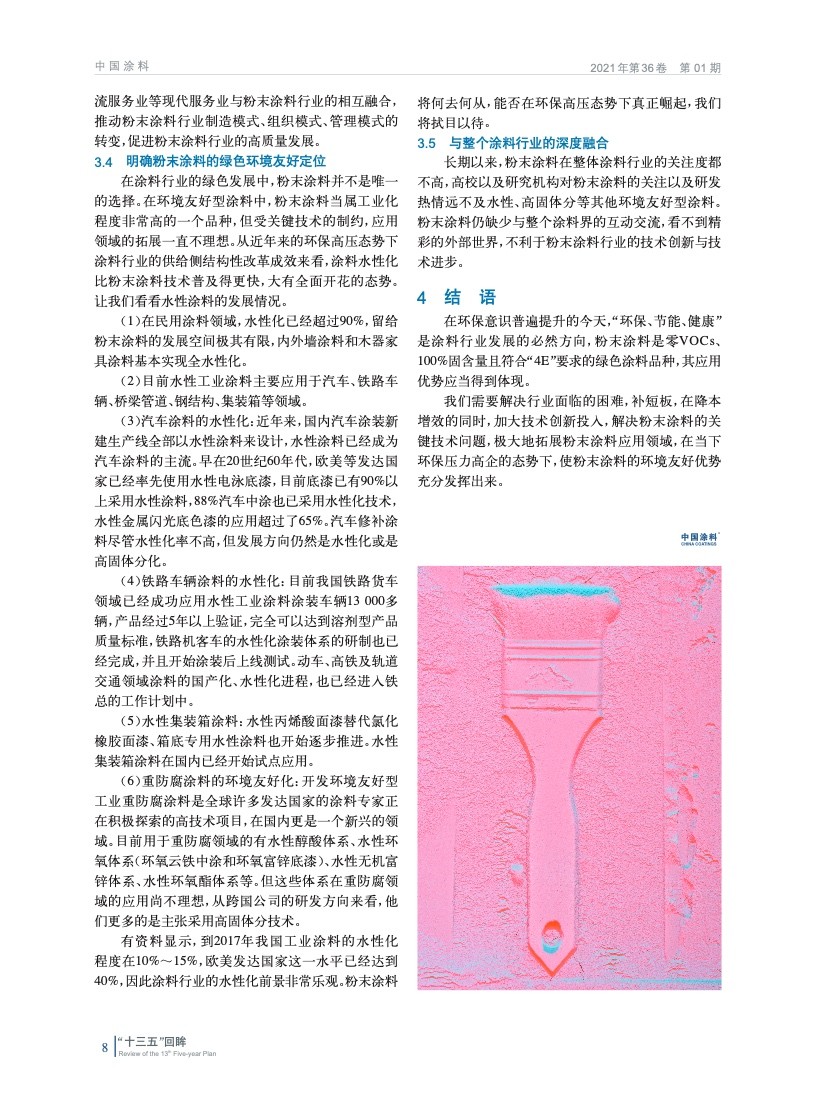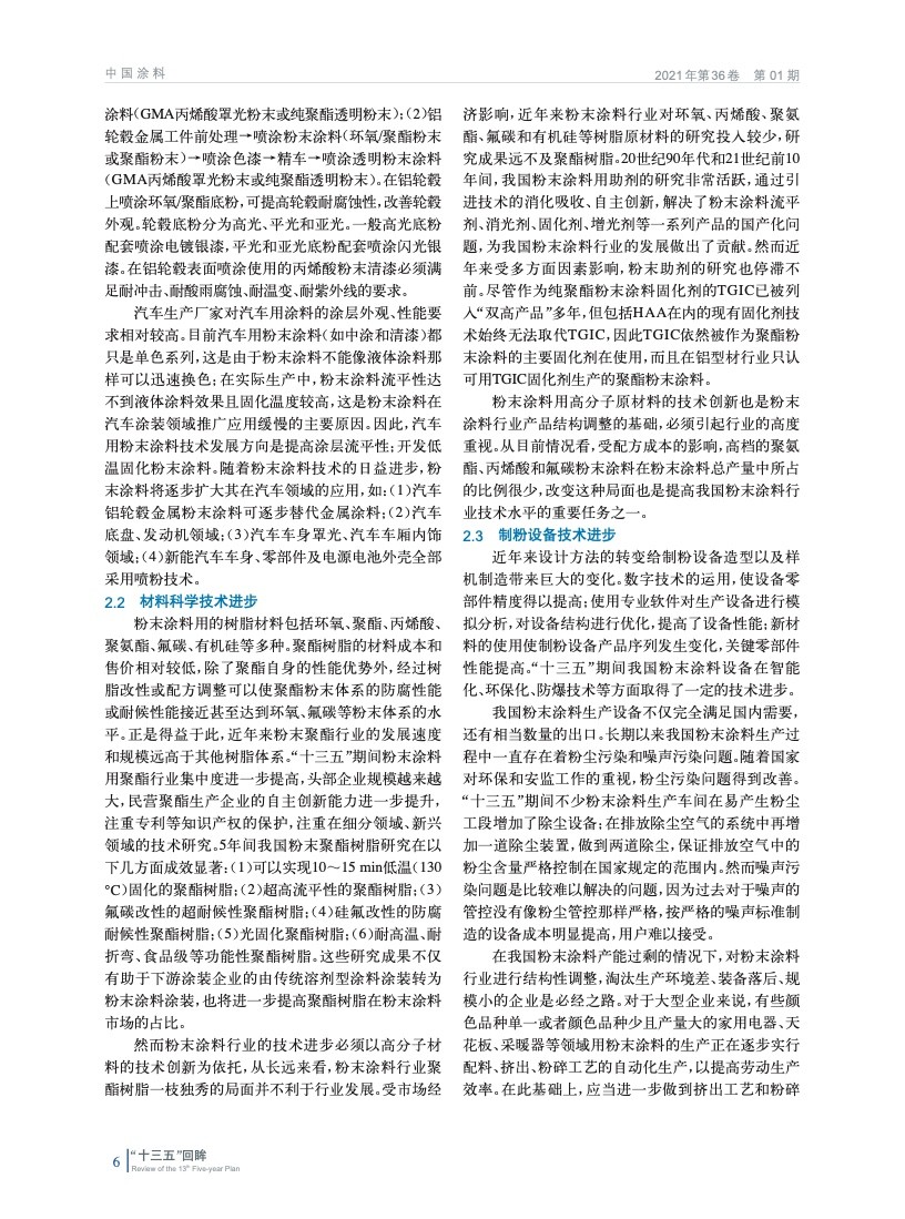闡述了“十三五”期間我國涂料工業經濟運行情況和粉末涂料的行業運行情況,分析了5年間粉末涂料及其原材料和制粉設備的技術進步,提出粉末涂料行業高質量發展需要解決的短板問題,對行業發展具有一定的指導意義。