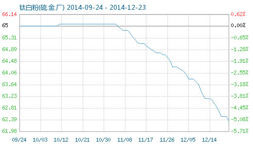 12月23日鈦白粉(硫.金.廠)商品指數(shù)為62.17,較昨日下降了0.16點,較周期內(nèi)最高點100.00點(2011-09-04)下降了37.83%,較2014年04月13日最低點61.70點上漲了0.76%。(注:周期指2011-09-01至今)