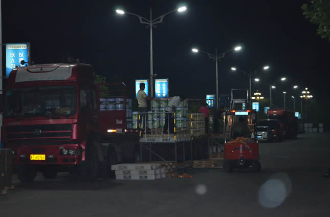 圖:夜間,在晨陽水漆廠區(qū)內(nèi)排起的裝貨卡車