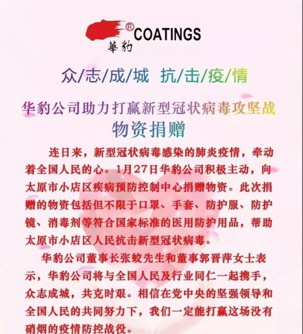 1月27日華豹公司積極主動,向太原市小店區(qū)疾病預防控制中心捐贈物資。此次捐贈的物資包括但不限于口罩、手套、防護服、防護鏡、消毒劑等符合國家標準的醫(yī)用防護用品,幫助太原市小店區(qū)人民抗擊新型冠狀病毒。