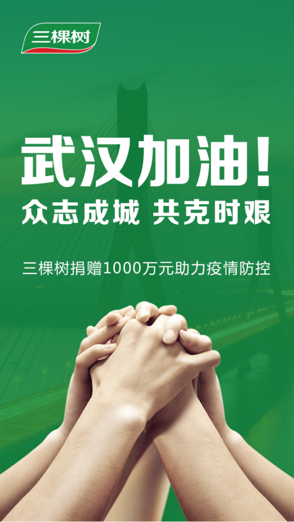 天災無情人有情,三棵樹將時刻關注疫情情況,積極承擔企業社會責任和弘揚大愛精神,還將通過匯聚企業、合作伙伴、員工等各方力量共同抗擊疫情,為在前線抗擊疫情的廣大醫務工作者提供更多力所能及的幫助。