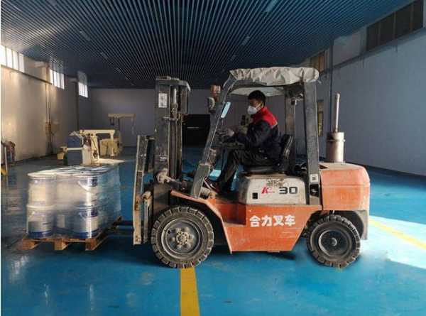 此時(shí),員工何海山開(kāi)著叉車(chē)過(guò)來(lái)了,正準(zhǔn)備將剩下的一包防火涂料裝上車(chē)。“每包涂料22桶,都是工人們加班加點(diǎn)生產(chǎn)出來(lái)的。”何海山心里有數(shù),他已往車(chē)上裝了14包。
