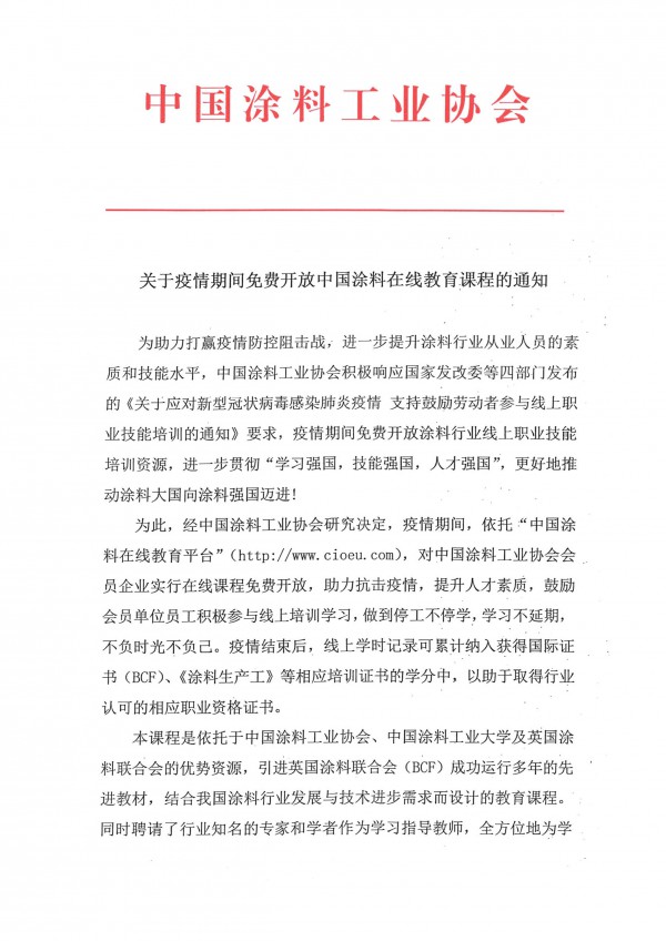 為此,經(jīng)中國(guó)涂料工業(yè)協(xié)會(huì)研究決定,疫情期間,依托“中國(guó)涂料在線教育平臺(tái)”(http://www.cioeu.com),對(duì)中國(guó)涂料工業(yè)協(xié)會(huì)會(huì)員企業(yè)實(shí)行在線課程免費(fèi)開(kāi)放,助力抗擊疫情,提升人才素質(zhì),鼓勵(lì)會(huì)員單位員工積極參與線上培訓(xùn)學(xué)習(xí),做到停工不停學(xué),學(xué)習(xí)不延期,不負(fù)時(shí)光不負(fù)己。疫情結(jié)束后,線上學(xué)時(shí)記錄可累計(jì)納入獲得國(guó)際證書(BCF)、《涂料生產(chǎn)工》等相應(yīng)培訓(xùn)證書的學(xué)分中,以助于取得行業(yè)認(rèn)可的相應(yīng)職業(yè)資格證書。