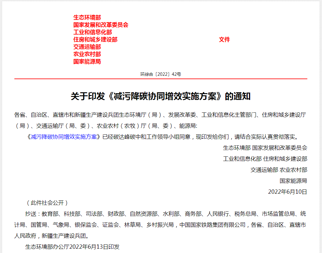 6月10日,生態(tài)環(huán)境部、發(fā)展改革委、工業(yè)和信息化部、住房城鄉(xiāng)建設(shè)部、交通運輸部、農(nóng)業(yè)農(nóng)村部、能源局聯(lián)合印發(fā)《減污降碳協(xié)同增效實施方案》