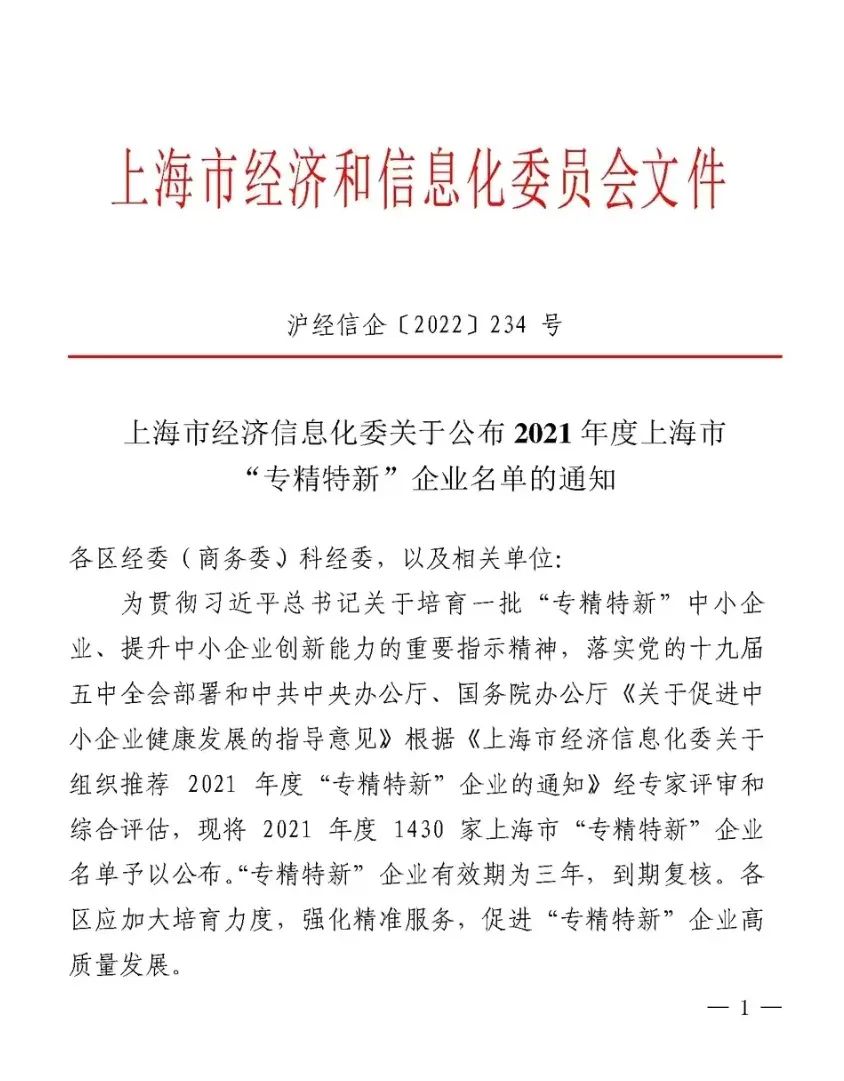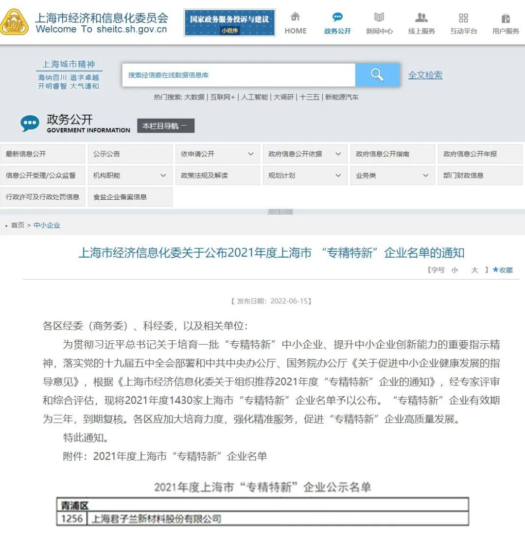 近日,上海市經濟和信息化委員會公布了2021年度上海市“專精特新”企業(yè)名單,上海君子蘭新材料股份有限公司榮登“專精特新”企業(yè)榜單!
