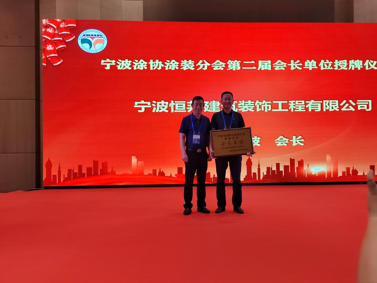 汪立波會長為當(dāng)選寧波市涂料與涂裝行業(yè)協(xié)會涂裝分會第二屆會長單位及會長——寧波恒邦建筑裝飾工程有限公司李世良總經(jīng)理授牌。