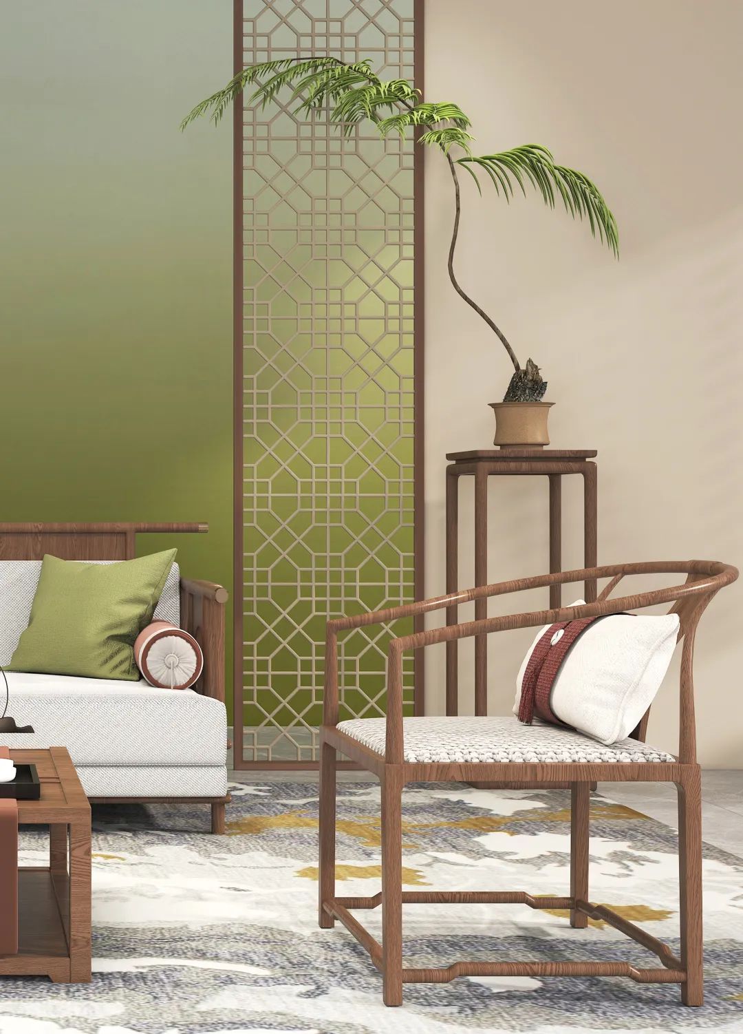 春辰綠與深棕色、米白色的組合,呈現靈動質樸的東方美學意境。簡約純粹的色彩,與中式家具的流暢線條相呼應,虛實之間盡顯詩意的文雅情趣。