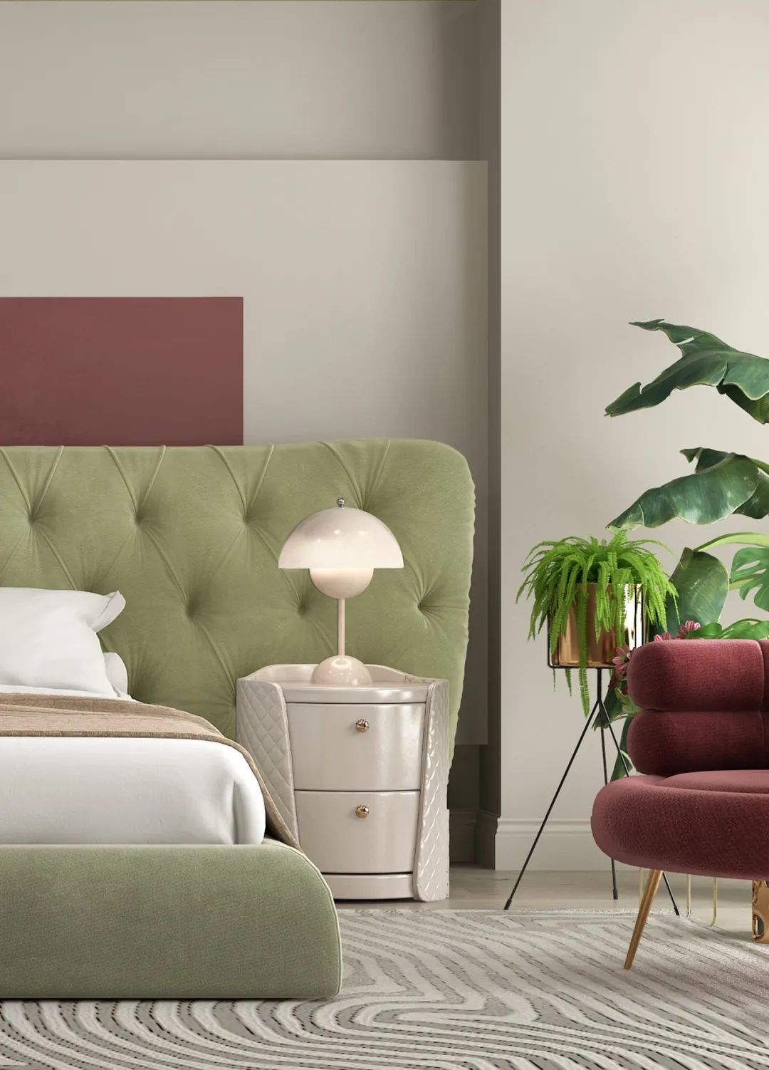 柔和的米白色基調之上,春辰綠與深紅色形成微妙、適度的色彩對比關系,色塊間的冷暖、明暗穿插組合,豐富了空間視覺層次,結合精致的裝飾元素,塑造優雅復古的高級感。