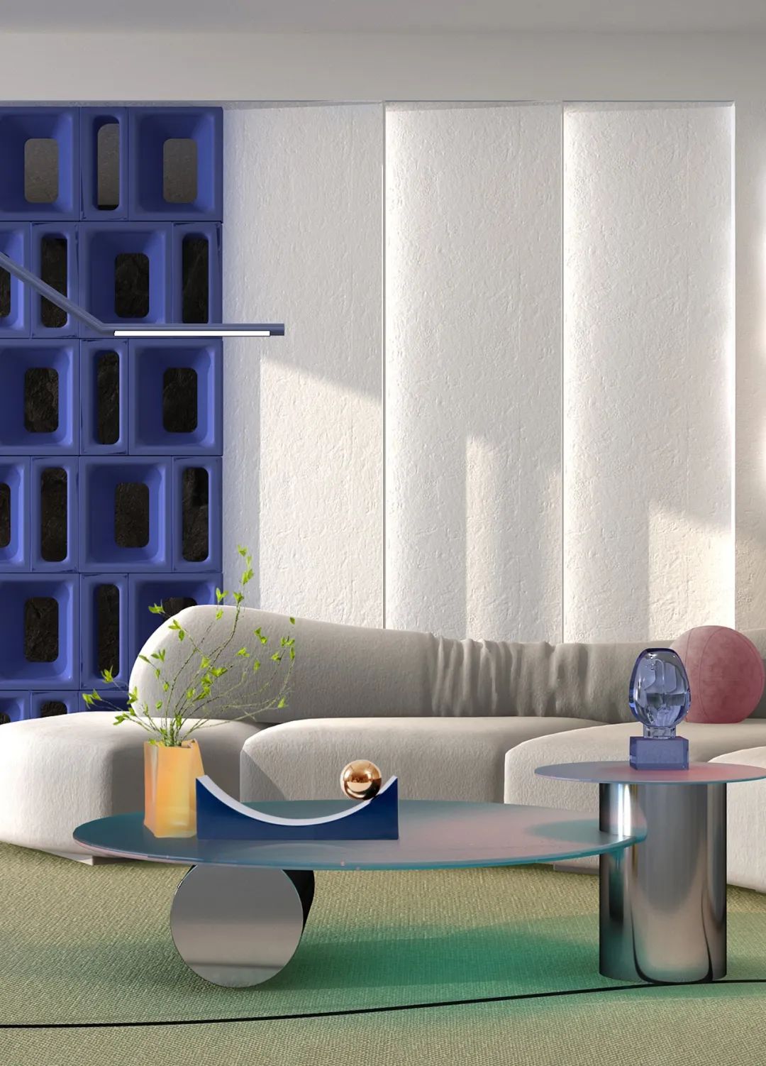 春辰綠搭配科技感的藍色與中性白色,形成和諧的冷色調組合;跳躍的明黃色與柔和的灰粉色作為小面積點綴,共同形成色彩間的視覺對比,打造充滿未來感,又不失前衛時尚的現代風格居室。