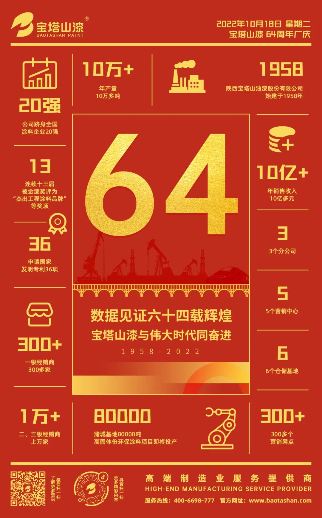 2022年10月18日,金秋十月,繁華似錦,乘著中國(guó)共產(chǎn)黨領(lǐng)導(dǎo)下的新時(shí)代風(fēng)云,陜西寶塔山油漆股份有限公司迎來(lái)了六十四歲生日,與偉大時(shí)代同奮進(jìn),創(chuàng)一流民族品牌。
