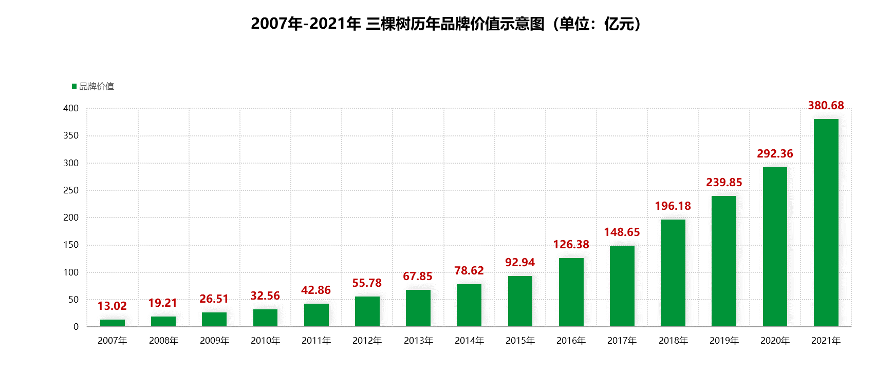 2007-2021年三棵樹歷年品牌價值示意圖 單位:億元