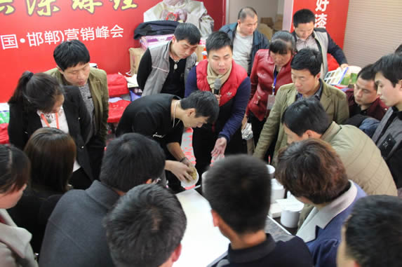 任長(zhǎng)峰介紹2015邯鄲招商優(yōu)惠政策,堅(jiān)定了經(jīng)營(yíng)華隆涂料的信心,也激起了經(jīng)銷商的訂貨熱情,尤其對(duì)水性涂料和新品興趣最濃,超過(guò)六成客戶現(xiàn)場(chǎng)下單。