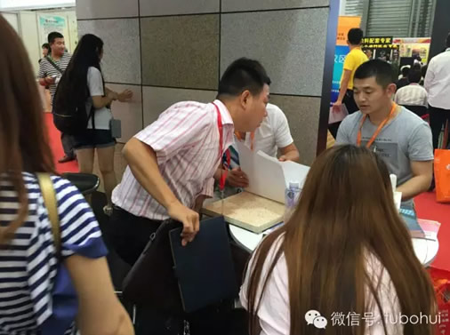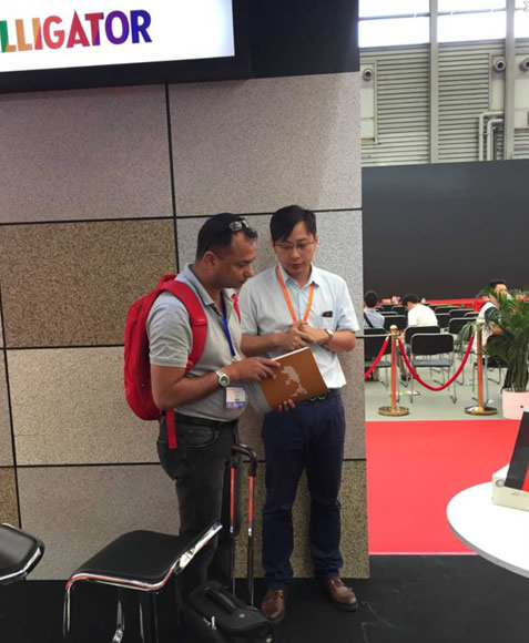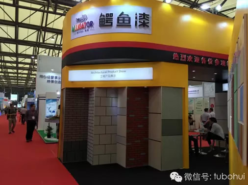 展會(huì)的另一大亮點(diǎn):鼎彩漆。此次鼎彩漆展示采用真的石頭和鼎彩漆涂料樣板對比的形式,鱷魚鼎彩漆樣板與石材幾乎亂真的表面紋理效果,充分體現(xiàn)出石材的厚重感的同時(shí)由于其涂層薄,自重輕,不影響建筑物的承重,深受甲方歡迎。在所有參觀者中有一位來自尼泊爾的買家給我們留下了深刻的印象,由于語言的限制,深諳英語口語的工程師王律擔(dān)任了接待這位客戶的重?fù)?dān),相信王工流利的口語、專業(yè)的產(chǎn)品知識解答也同樣給尼泊爾買家一個(gè)的印象。